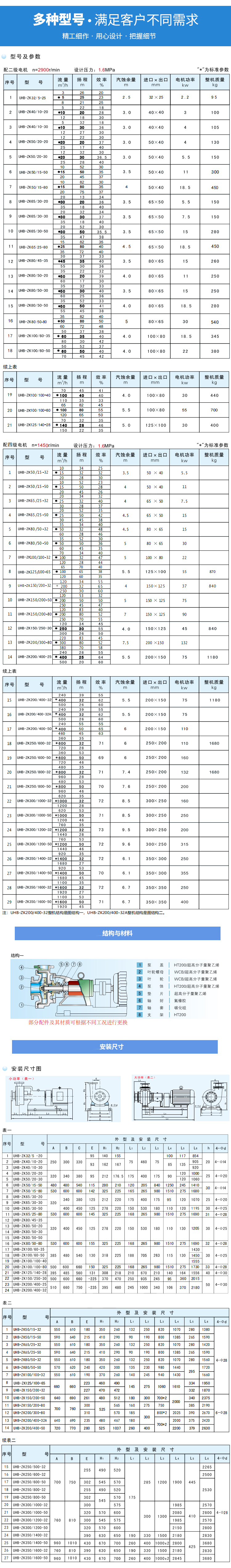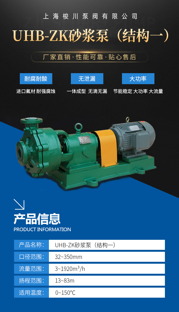 用途 本產品廣泛適用于:酸、堿、鹽、油類、食品飲料、酒類、有機溶劑等液體,尤其適用于輸送含細穎粒狀的強腐蝕性液體。 適用溫度:-20℃~80℃ 設計特點 耐離耐磨 UHB-zK型系列砂漿泵為懸臂式單級、單吸離心泵,其過流部件采用鋼襯超高分子量聚乙烯制造,具有較強的耐腐蝕性、卓越的耐磨性、抗蠕變性(耐環境應力開裂),同時采用金屬基體結構,提高了產品的承壓能力。 多功能 一種泵能適應各種不同的工況。如:既可以輸送酸、堿類清液或料漿,也可以輸送冶煉行業各種腐蝕性礦漿,還可以輸送硫酸行業各類稀酸、環保行業的各類污水等。 多種密封 該系列泵采用多種密封方式:K型動力密封、單端面機械密封、集裝式機封和雙端面機械密封,可根據具體工況條件選用。