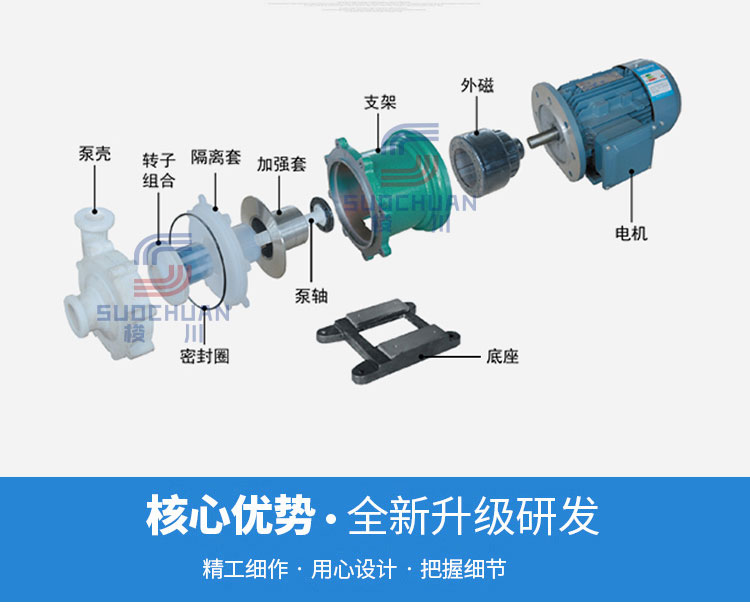 用途 本產品廣泛適用于:石油化工、制酸制堿有色金屬冾煉、汽車制造的酸洗工藝、稀土分離、農藥、染料、醫藥、造紙、電鍍、無線電等行業。適用溫度:-20℃C~100℃。 設計特點 防漏設計取消了軸封,利用磁力耦合間接驅動,完全消除了滴漏的煩惱,絕不污染場地。由于泵的過流部分選用“氟塑料合金”制造??蛇B續輸送任意濃度的酸、堿、強氧化劑等腐蝕介質而毫不受損。 工作原理 驅動裝置采用主動磁性聯軸器直接裝在電機軸上,泵腔完全封閉,通過磁力耦合間接驅動泵軸上帶磁鋼的葉輪旋轉,結構緊湊、安全節能。 堅固耐用的泵體 結構雖然接觸液體部分是氟塑料,但泵體基體是金屬材料,故泵體可以承受部分管道的重量及機械性沖擊,堅固耐用。