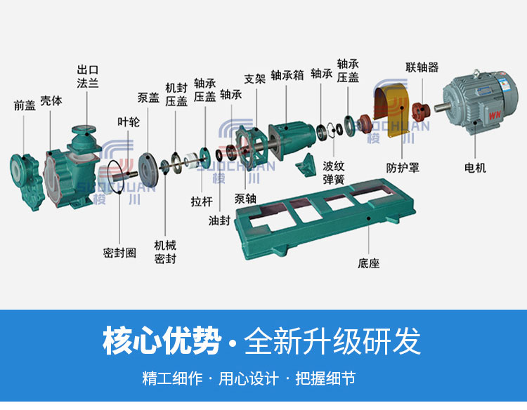 過流部件采用氟塑料、氟塑料合金制造,耐腐蝕性能優異?;w采用金屬材料制造,耐壓能力強。